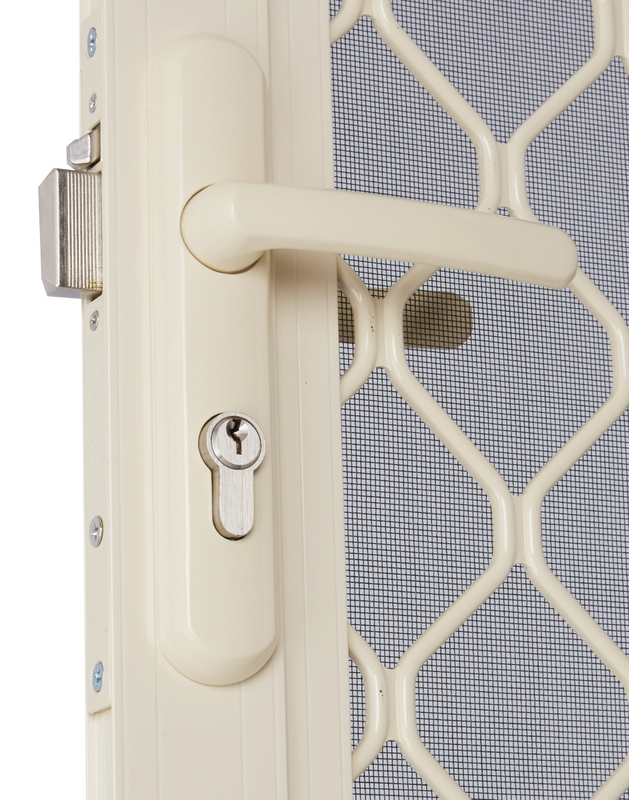 The 7 mm Diamond hinged screen door is fitted with a single deadlock or the option to upgrade to a triple locking system. Locking system come with two keys and 12 month warranty. Two heavy duty steel hinges are fitted to the frame. Both locks and hinges are available in four colours. The 7 mm Diamond grille is riveted to the frame and backed with fibreglass gauze with the option to upgrade to midge mesh or paw proof mesh.